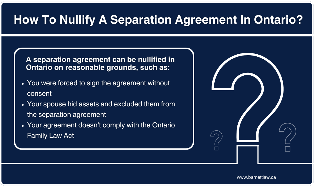 A separation agreement can be nullified under section 56(4)(c) of the Ontario Family Law Act. These include: